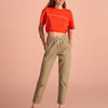 High waisted pants with elastic waistband and adjustable drawstring.Side and back pockets.