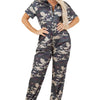 Sexy jumpsuit with short sleeves, Spread collar, Front button closure Elastic waist, side pocket, and Elastic cuffs.